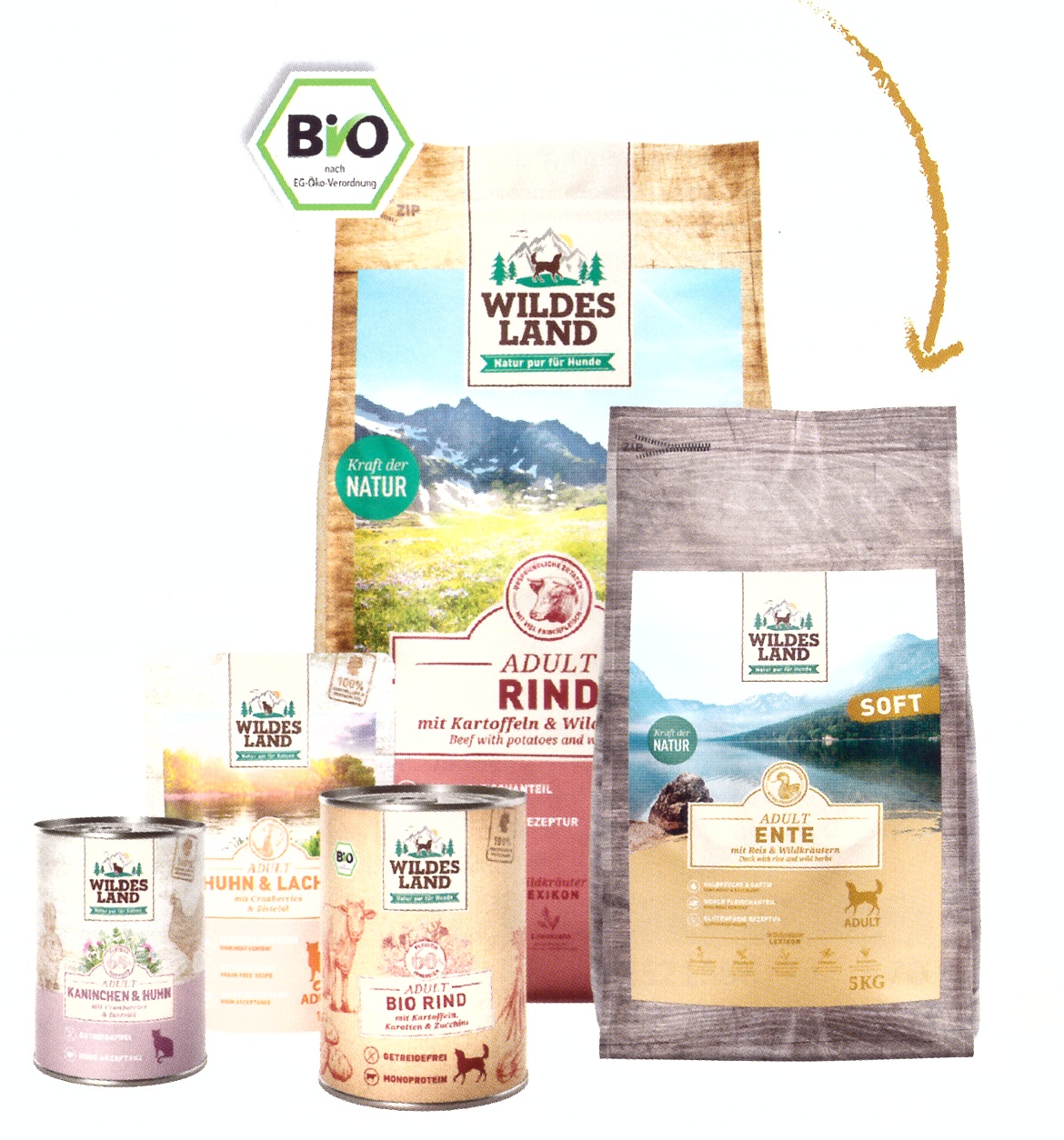Wildes Land Classic avec une forte teneur en viande, fruits, légumes et herbes sauvages. Cela apporte ainsi un maximum de nature dans les écuelles de nos animaux.
